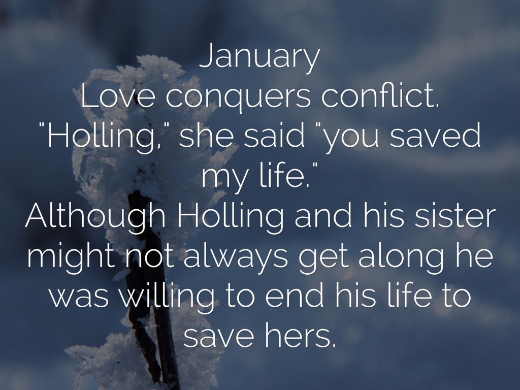 January Love conquers conflict. "Holling," she said "you saved my life." Although Holling and his sister might not always get along he was willing to end his life to save hers.