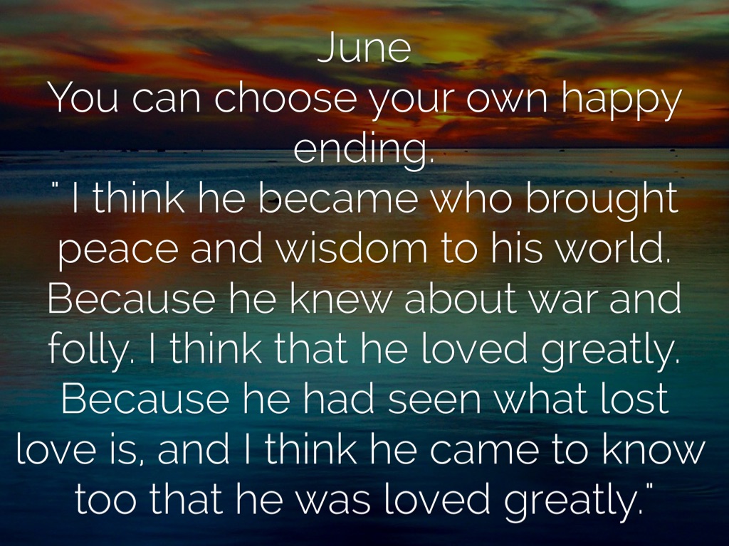 June You can choose your own happy ending. " I think he became who brought peace and wisdom to his world. Because he knew about war and folly. I think that he loved greatly. Because he had seen what lost love is, and I think he came to know too that he was loved greatly."