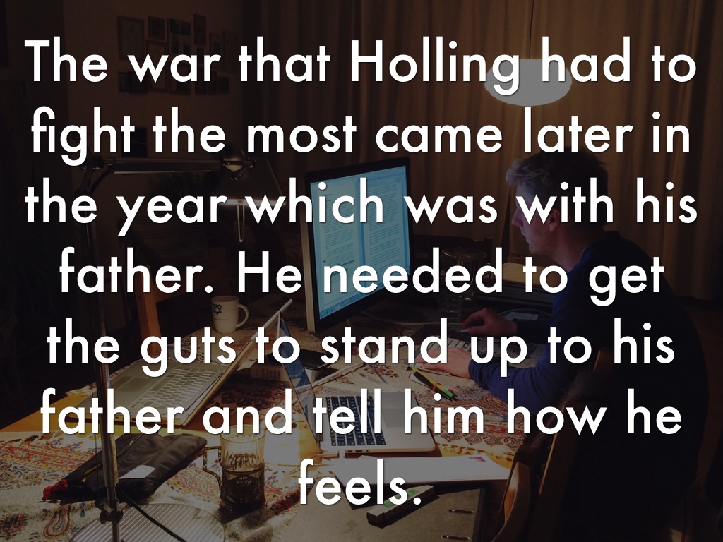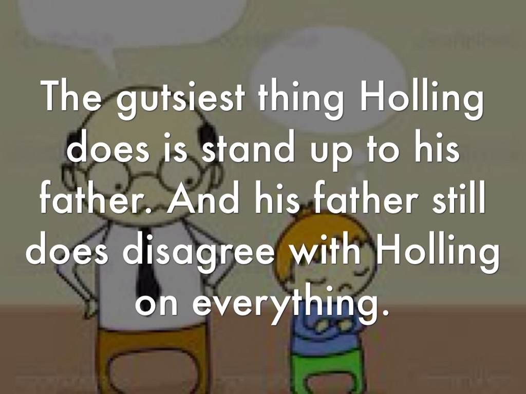 The war that Holling had to fight the most came later in the year which was with his father. He needed to get the guts to stand up to his father and tell him how he feels.