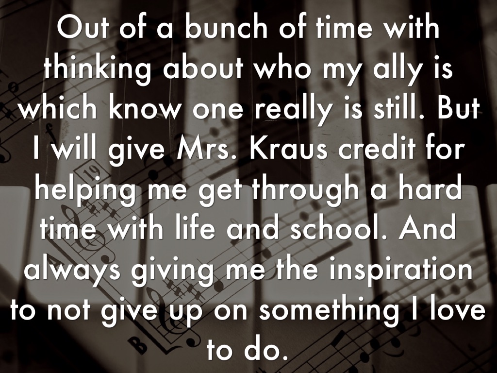 Out of a bunch of time with thinking about who my ally is which know one really is still. But I will give Mrs. Kraus credit for helping me get through a hard time with life and school. And always giving me the inspiration to not give up on something I love to do.