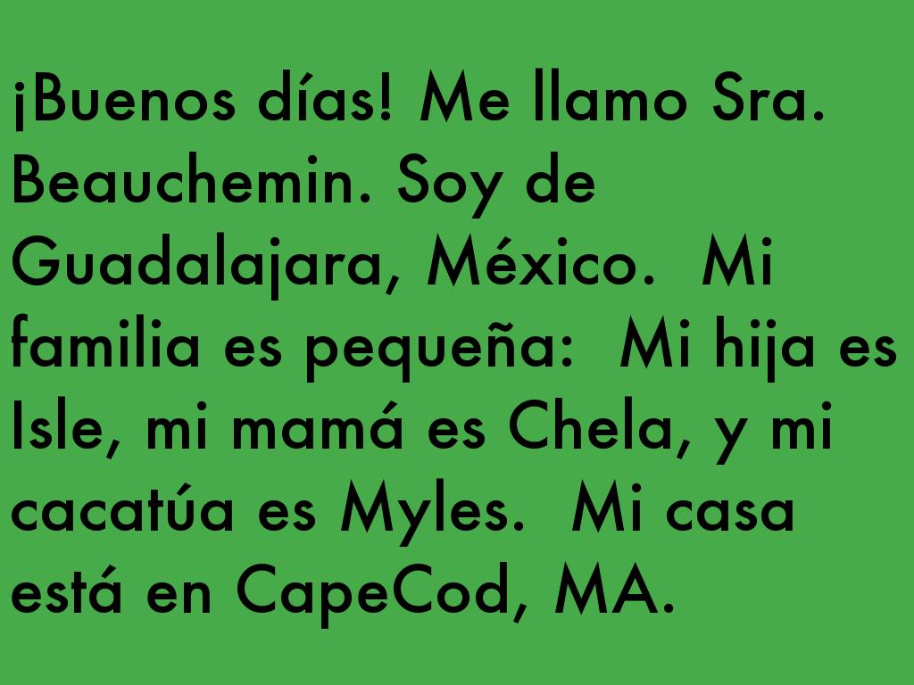 ¡Buenos días! Me llamo Sra. Beauchemin. Soy de Guadalajara, México. Mi familia es pequeña: Mi hija es Isle, mi mamá es Chela, y mi cacatúa es Myles. Mi casa está en CapeCod, MA.