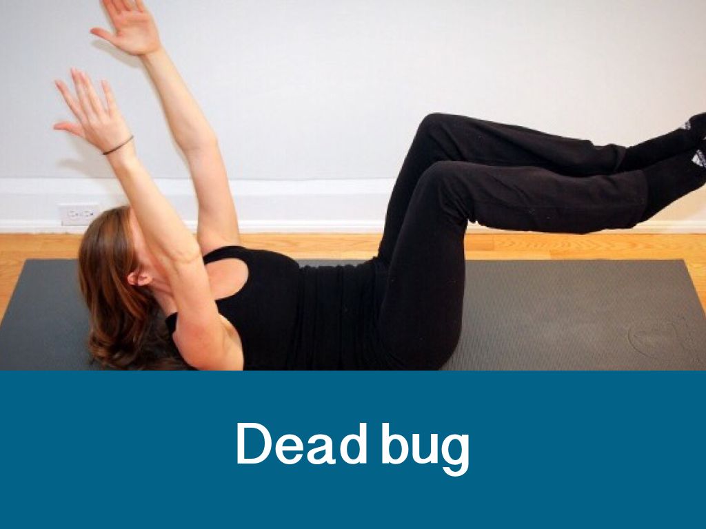 Dead bug - hands pointing up to ceiling, knees stacked over hips, legs bent; push lower back into floor & stretch arms to ceiling, lifting head and shoulders off floor