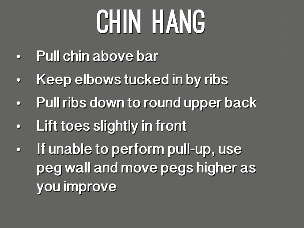 If unable to perform pull-up, use peg wall and move pegs higher as you improve