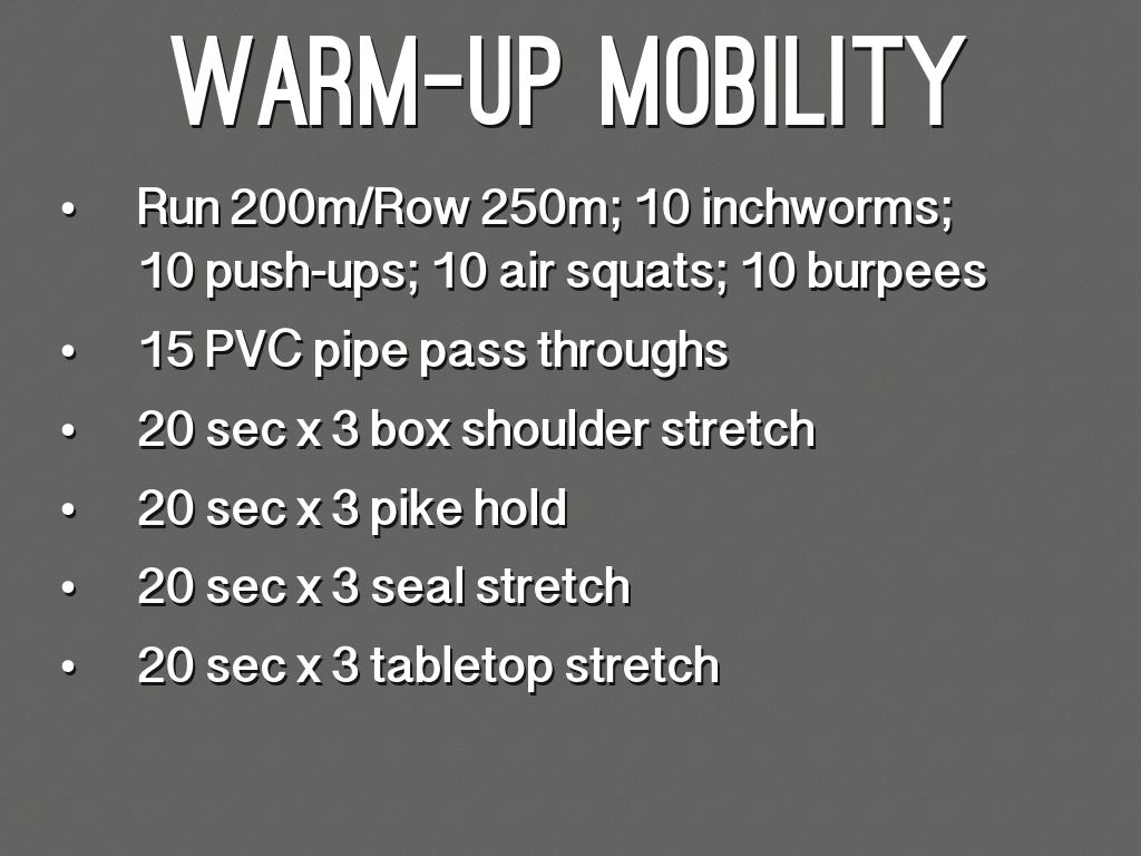 Run 200m/Row 250m; 10 inchworms; 10 push-ups; 10 air squats; 10 burpees
