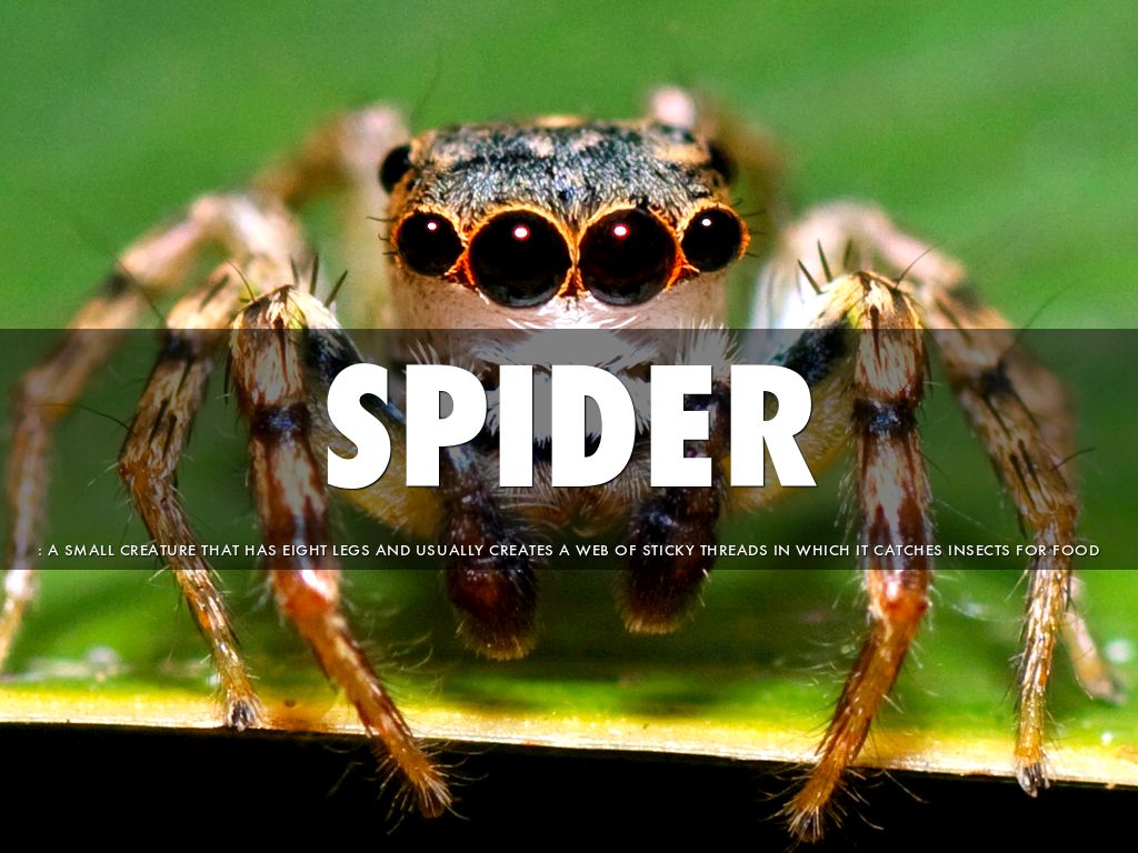 : A SMALL CREATURE THAT HAS EIGHT LEGS AND USUALLY CREATES A WEB OF STICKY THREADS IN WHICH IT CATCHES INSECTS FOR FOOD