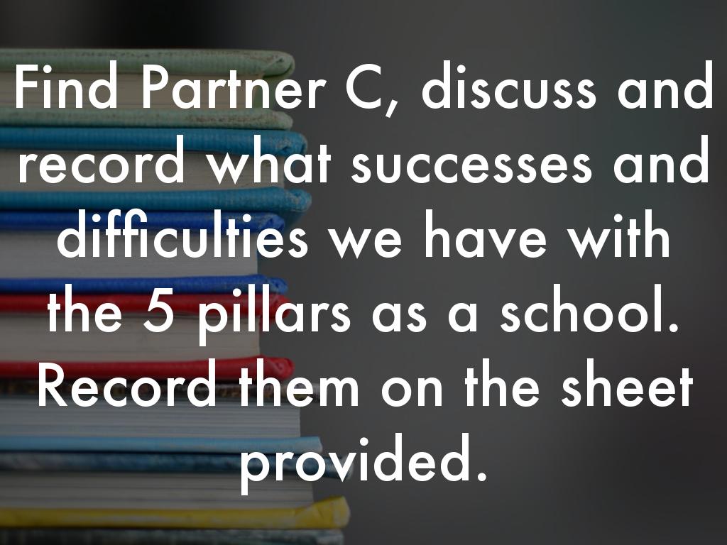 Find Partner C, discuss and record what successes and difficulties we have with the 5 pillars as a school. Record them on the sheet provided.