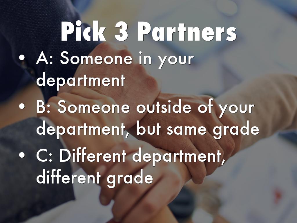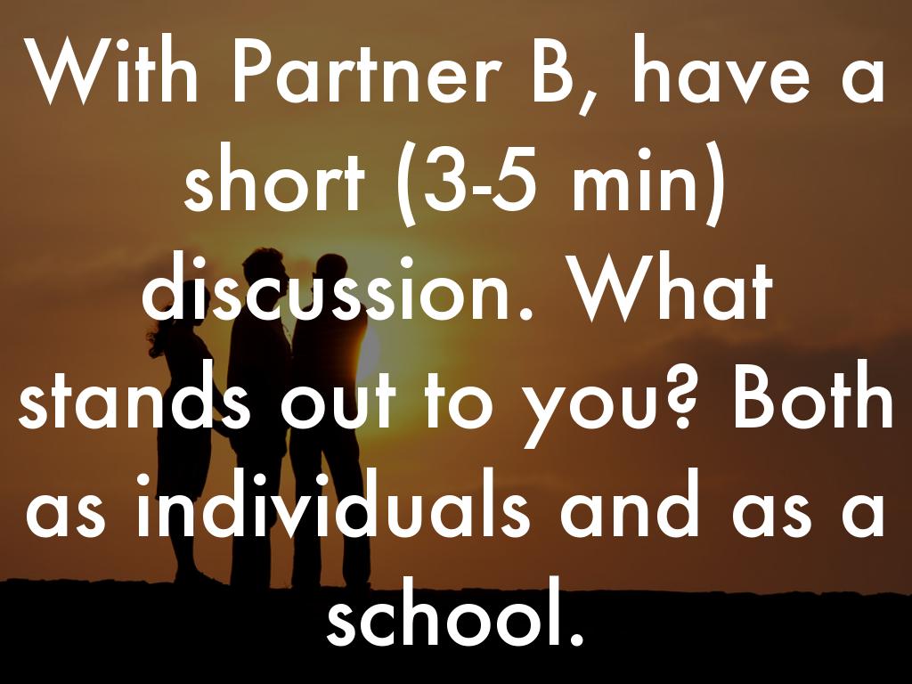 With Partner B, have a short (3-5 min) discussion. What stands out to you? Both as individuals and as a school.