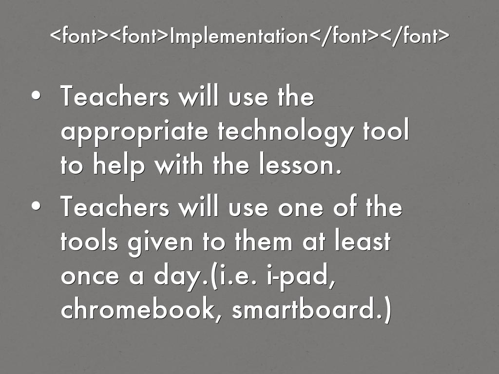 • Teachers will use one of the tools given to them at least once a day.(i.e. i-pad, chromebook, smartboard.)