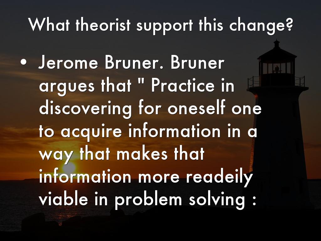 • Jerome Bruner. Bruner argues that " Practice in discovering for oneself one to acquire information in a way that makes that information more readeily viable in problem solving :