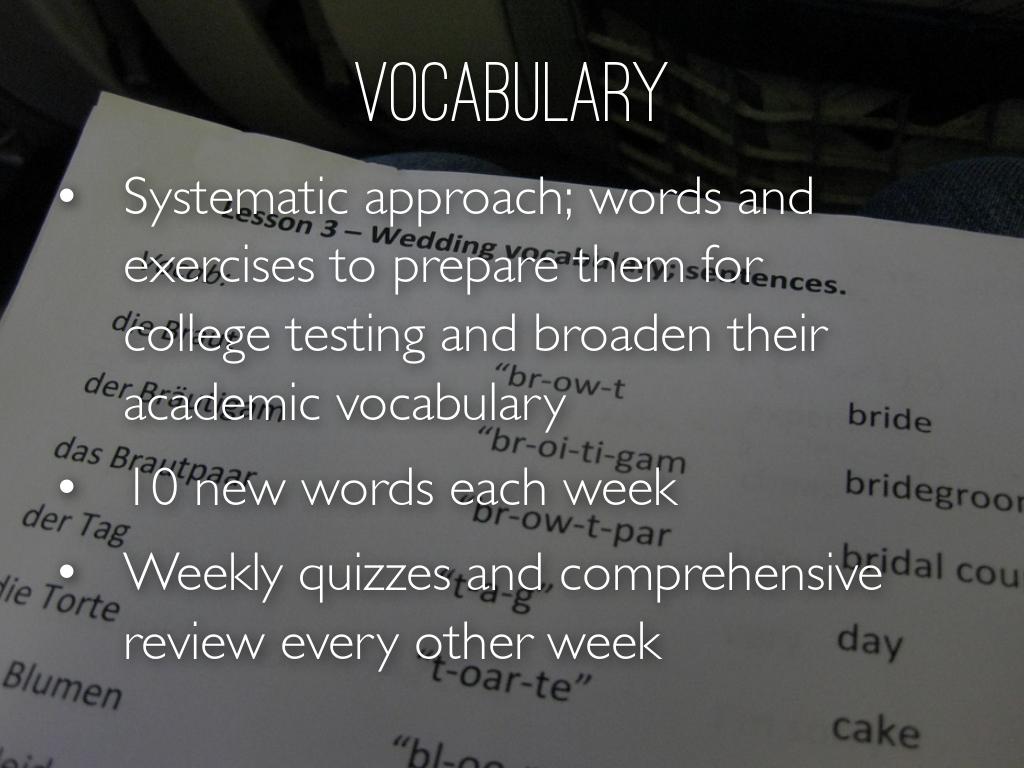 Systematic approach; words and exercises to prepare them for college testing and broaden their academic vocabulary