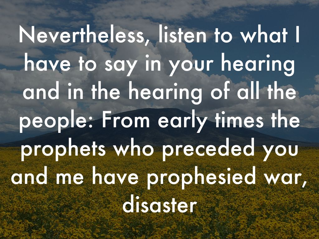 Nevertheless, listen to what I have to say in your hearing and in the hearing of all the people: From early times the prophets who preceded you and me have prophesied war, disaster