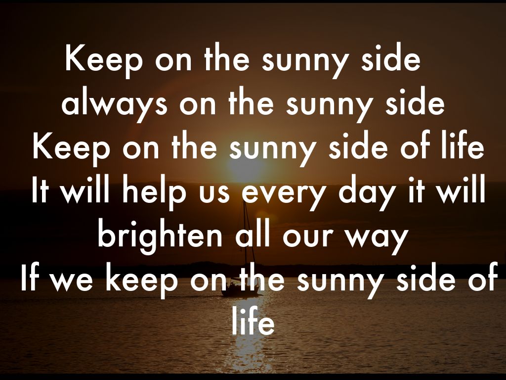 Keep on the sunny side always on the sunny side Keep on the sunny side of life It will help us every day it will brighten all our way If we keep on the sunny side of life