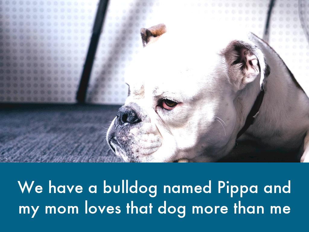 We have a bulldog named Pippa and my mom loves that dog more than me