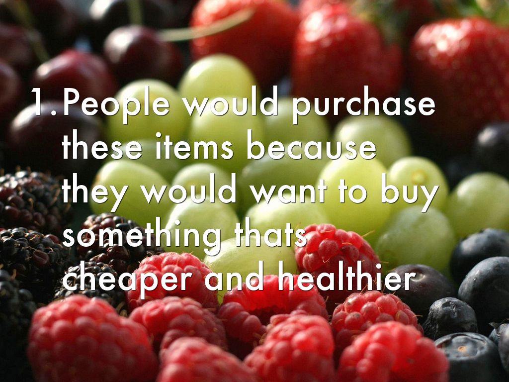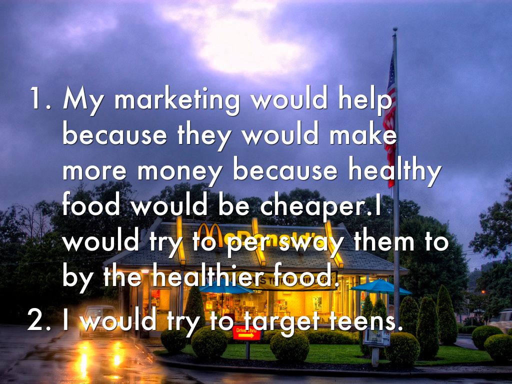 My marketing would help because they would make more money because healthy food would be cheaper.I would try to per sway them to by the healthier food.