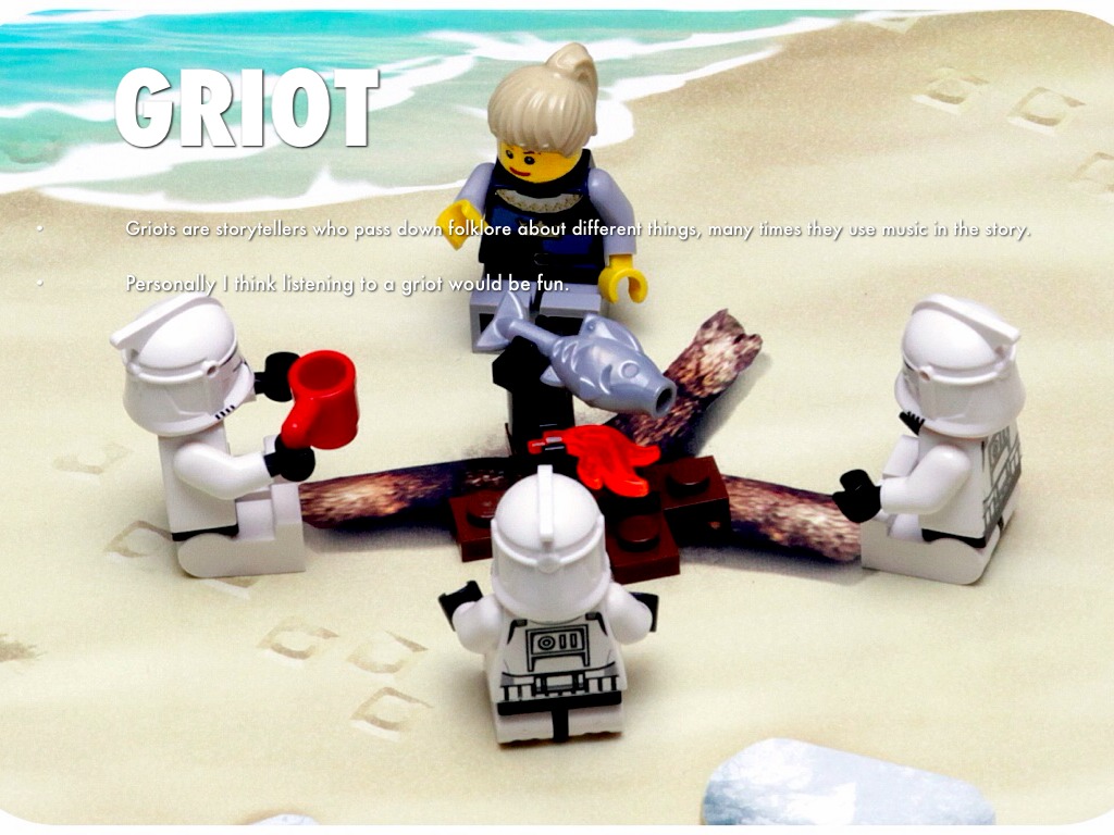 Griots are storytellers who pass down folklore about different things, many times they use music in the story.