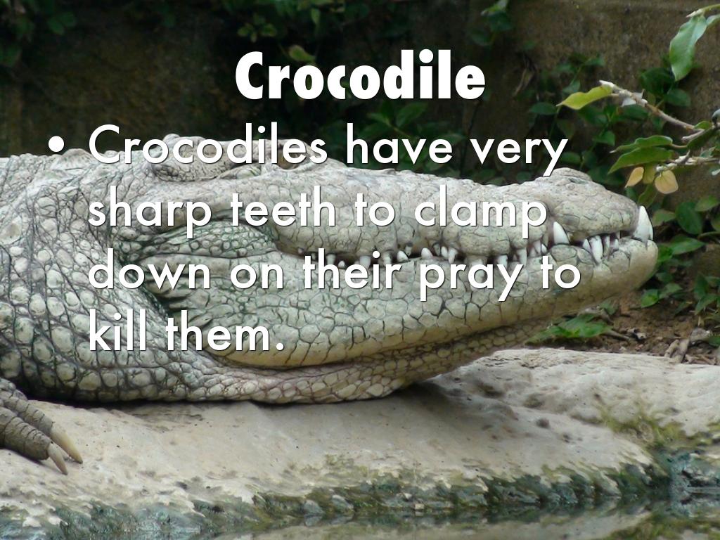 Crocodiles have very sharp teeth to clamp down on their pray to kill them.