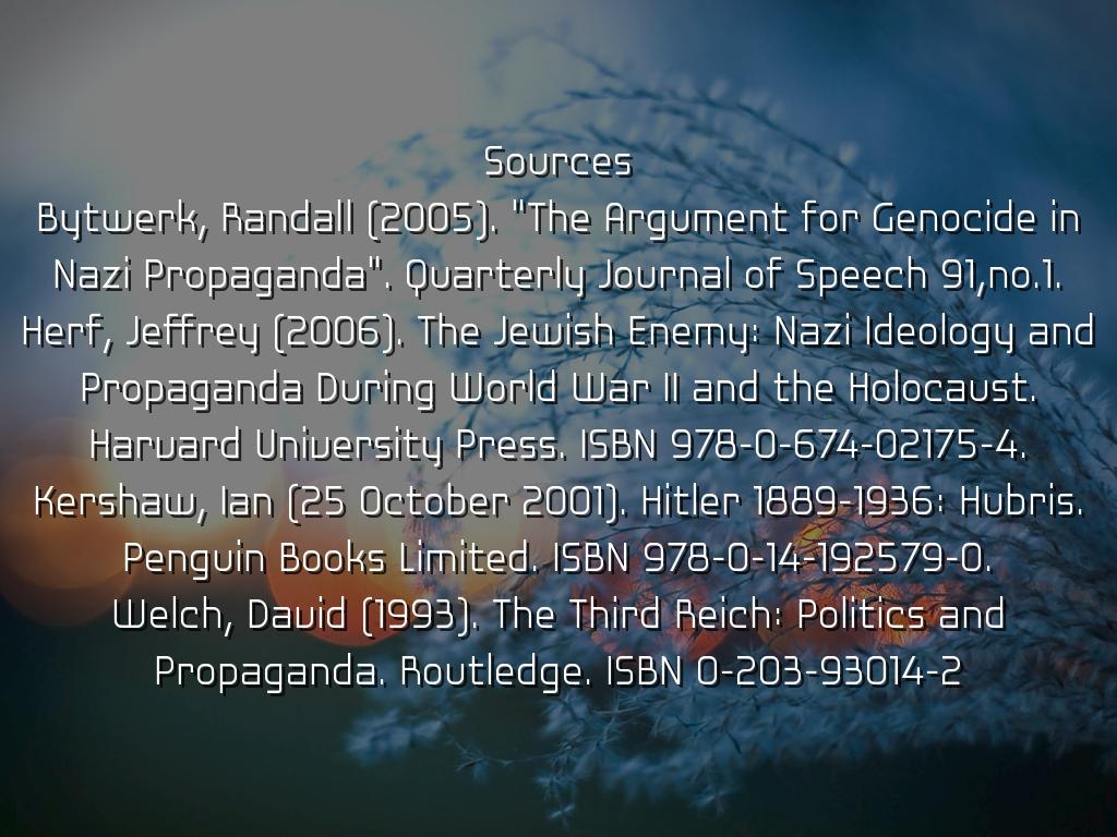 Sources Bytwerk, Randall (2005). "The Argument for Genocide in Nazi Propaganda". Quarterly Journal of Speech 91,no.1. Herf, Jeffrey (2006). The Jewish Enemy: Nazi Ideology and Propaganda During World War II and the Holocaust. Harvard University Press. ISBN 978-0-674-02175-4. Kershaw, Ian (25 October 2001). Hitler 1889-1936: Hubris. Penguin Books Limited. ISBN 978-0-14-192579-0. Welch, David (1993). The Third Reich: Politics and Propaganda. Routledge. ISBN 0-203-93014-2