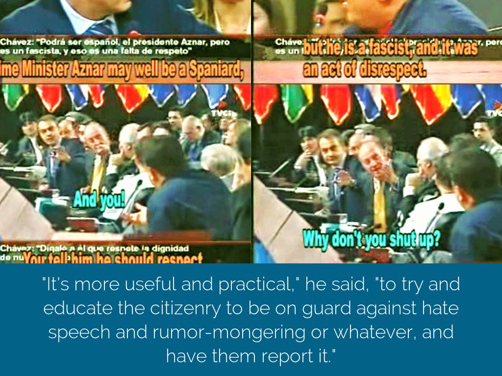 "It's more useful and practical," he said, "to try and educate the citizenry to be on guard against hate speech and rumor-mongering or whatever, and have them report it."