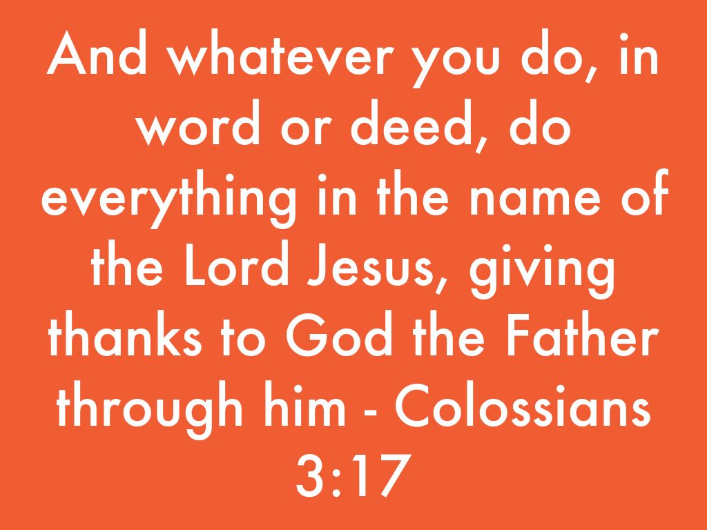 And whatever you do, in word or deed, do everything in the name of the Lord Jesus, giving thanks to God the Father through him - Colossians 3:17
