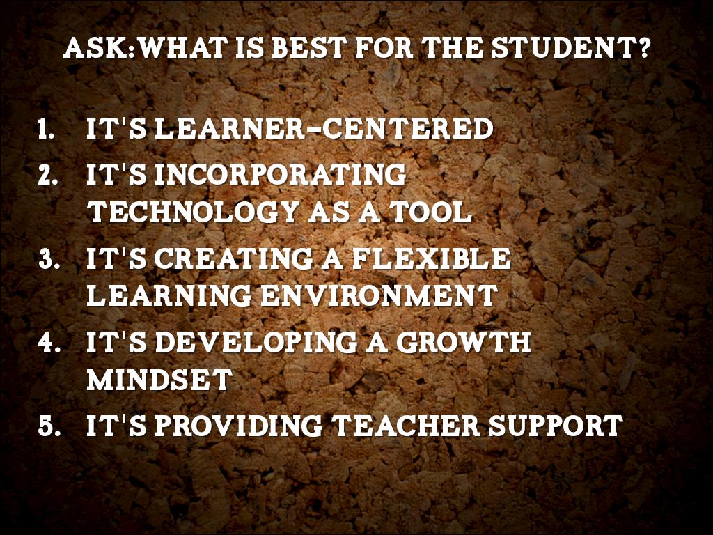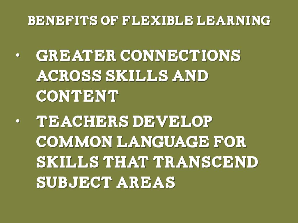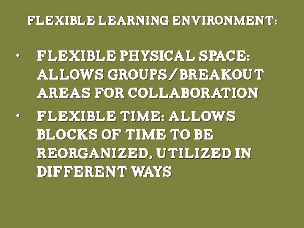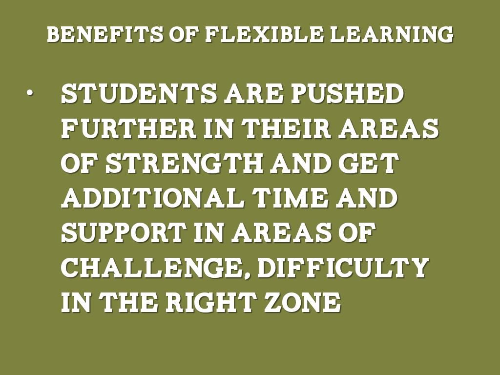 Flexible student grouping: students are then grouped and regrouped in response to that data, allowed to work on specific areas, difficulty can be adjusted