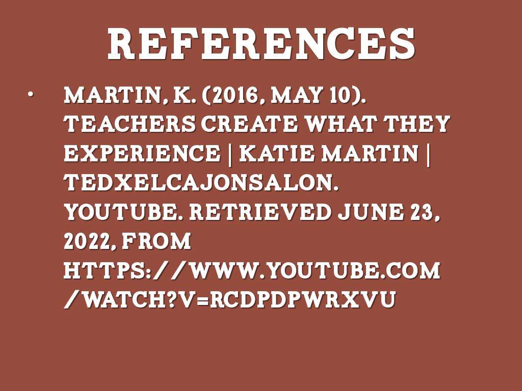 Martin, K. (2016, May 10). Teachers create what they experience | Katie Martin | tedxelcajonsalon. YouTube. Retrieved June 23, 2022, from https://www.youtube.com/watch?v=rcDpDPwRxvU