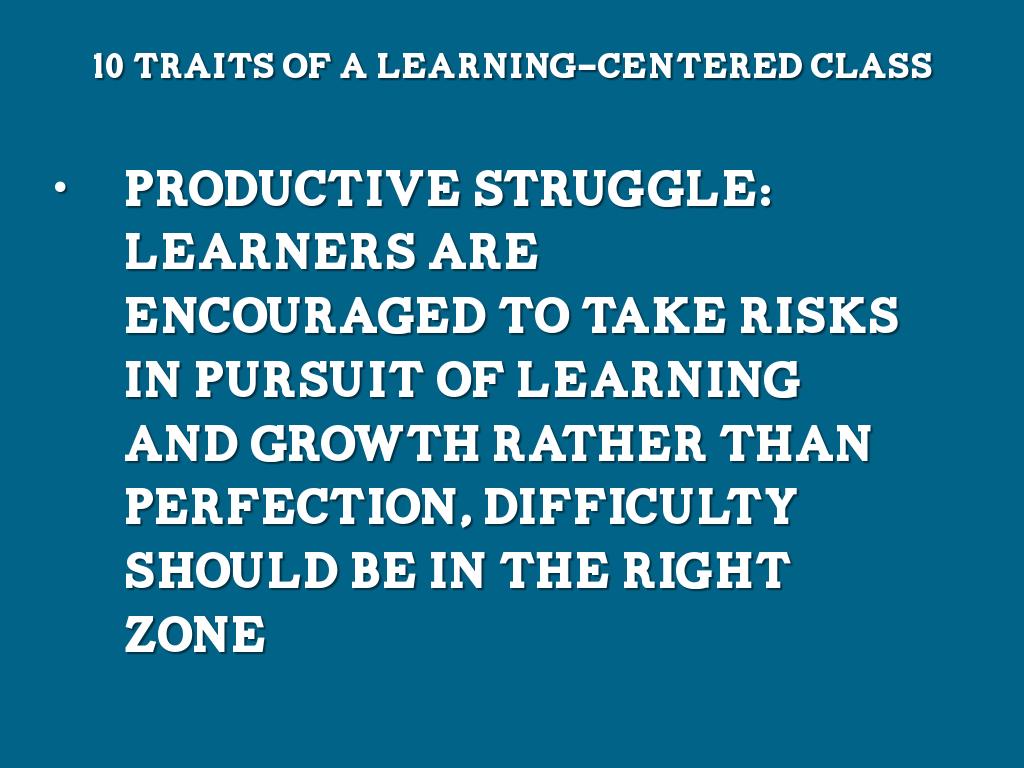 Productive Struggle: Learners are encouraged to take risks in pursuit of learning and growth rather than perfection, difficulty should be in the right zone