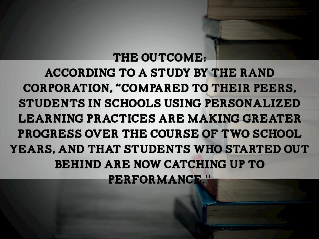 The Outcome: According to a study by the Rand Corporation, “compared to their peers, students in schools using personalized learning practices are making greater progress over the course of two school years, and that students who started out behind are now catching up to performance.''