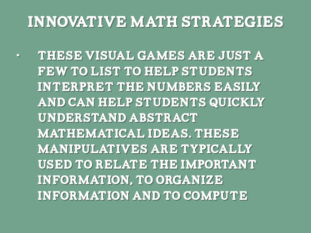 These visual games are just a few to list to help students interpret the numbers easily and can help students quickly understand abstract mathematical ideas. These manipulatives are typically used to relate the important information, to organize information and to compute the answer to a problem.