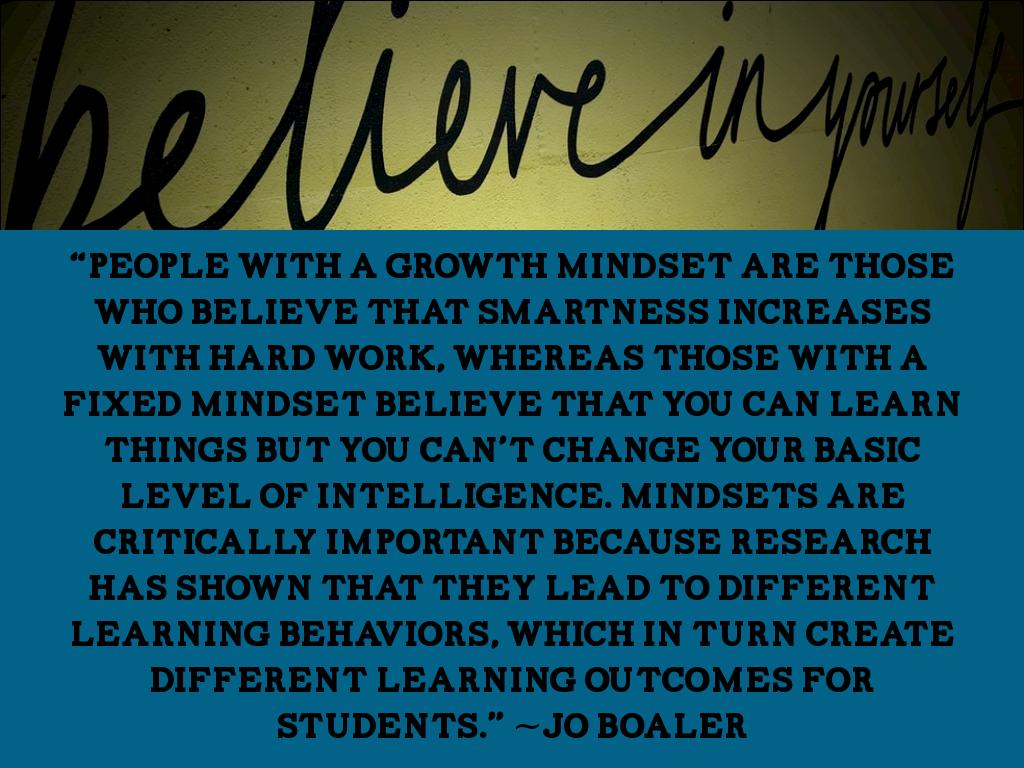 “People with a growth mindset are those who believe that smartness increases with hard work, whereas those with a fixed mindset believe that you can learn things but you can’t change your basic level of intelligence. Mindsets are critically important because research has shown that they lead to different learning behaviors, which in turn create different learning outcomes for students.” ~Jo Boaler