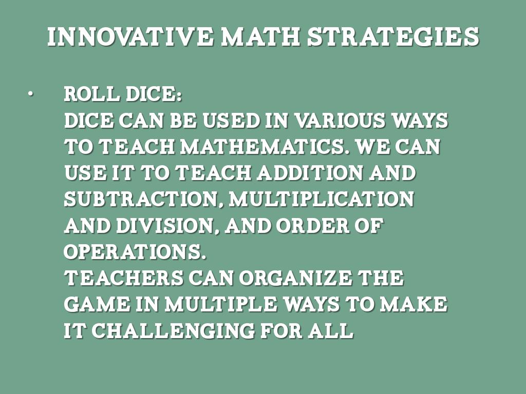 Dice can be used in various ways to teach mathematics. We can use it to teach addition and subtraction, multiplication and division, and order of operations.