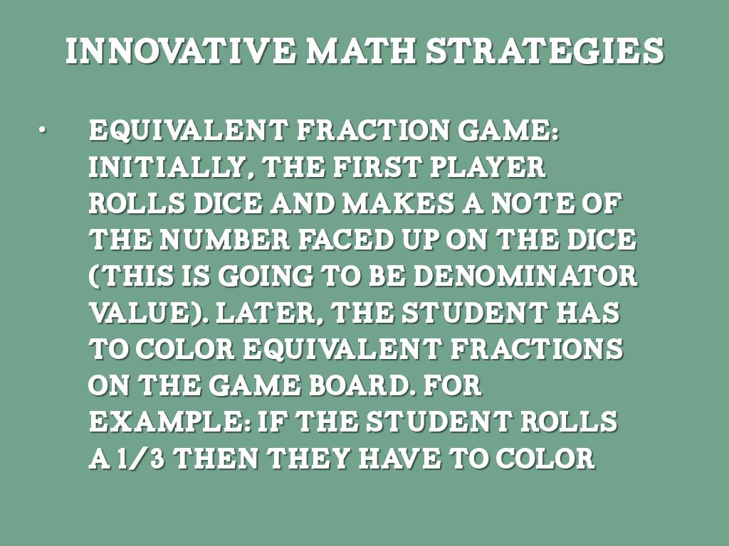 Initially, the first player rolls dice and makes a note of the number faced up on the dice (this is going to be denominator value). Later, the student has to color equivalent fractions on the game board. For example: if the student rolls a 1/3 then they have to color 1/3 rectangle, 2/6 rectangle, and 4/12 rectangle.
