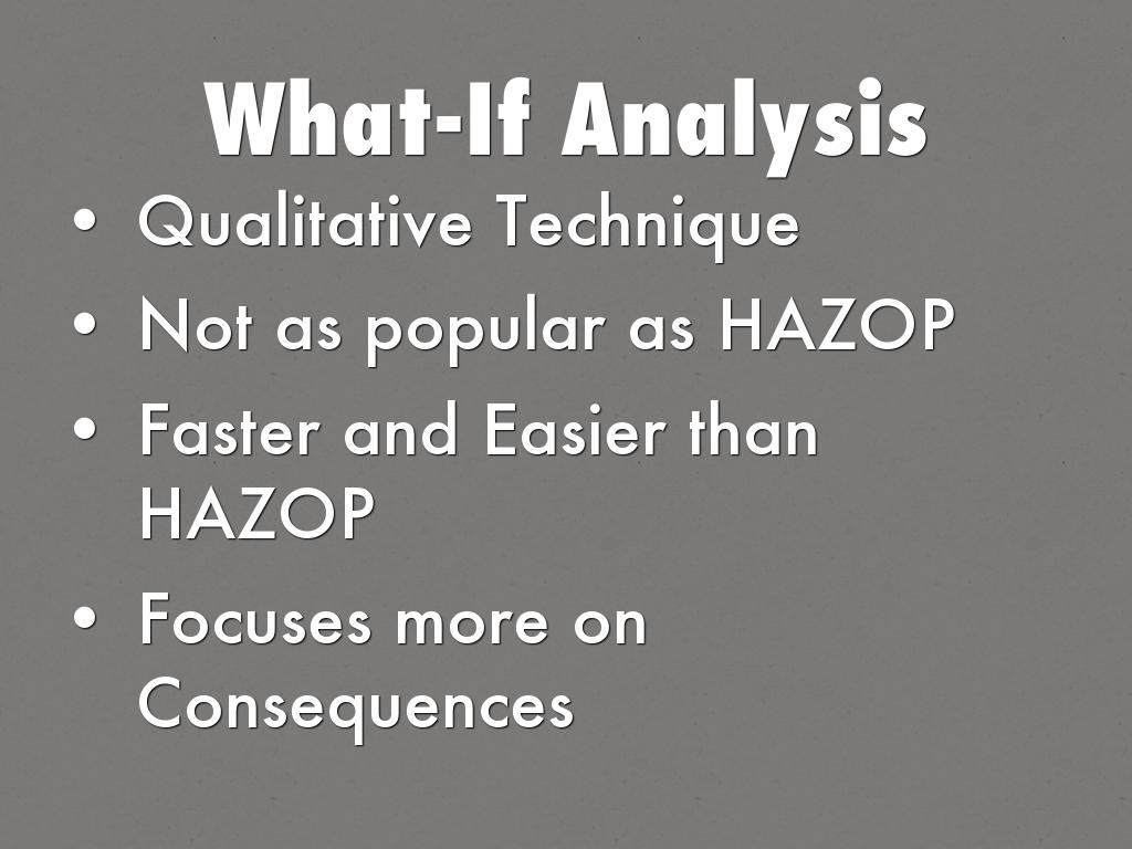 The What-If Analysis is a less popular Hazard and Risk Assessment method than HAZOP, but is easier and faster to use. Please visit https://www.abhisam.com for more information.
