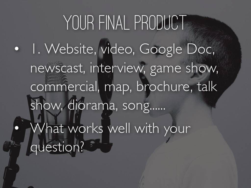 1. Website, video, Google Doc, newscast, interview, game show, commercial, map, brochure, talk show, diorama, song......