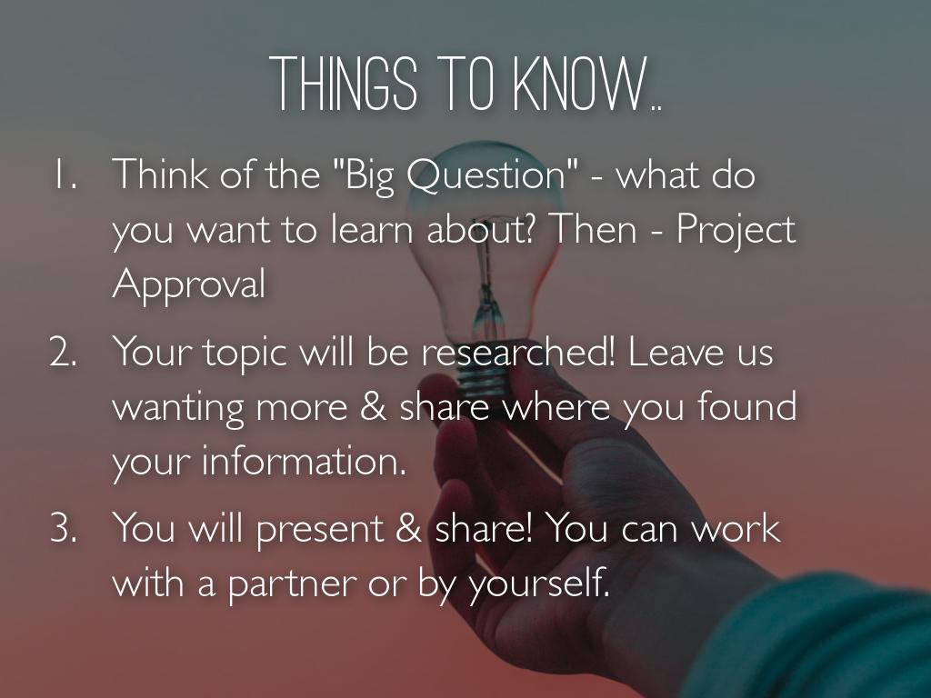 Think of the "Big Question" - what do you want to learn about? Then - Project Approval