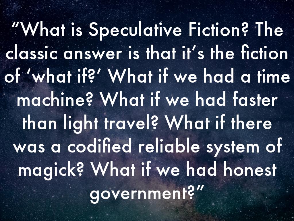 “What is Speculative Fiction? The classic answer is that it’s the fiction of ‘what if?’ What if we had a time machine? What if we had faster than light travel? What if there was a codified reliable system of magick? What if we had honest government?”