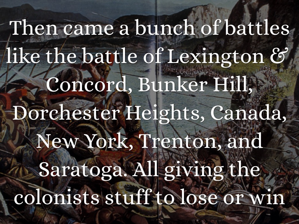Then came a bunch of battles like the battle of Lexington & Concord, Bunker Hill, Dorchester Heights, Canada, New York, Trenton, and Saratoga. All giving the colonists stuff to lose or win