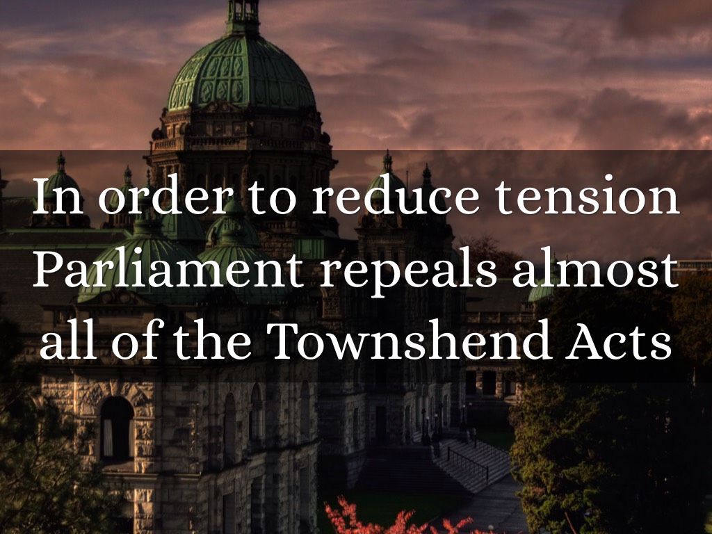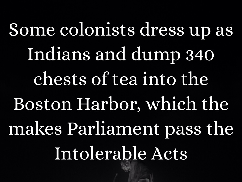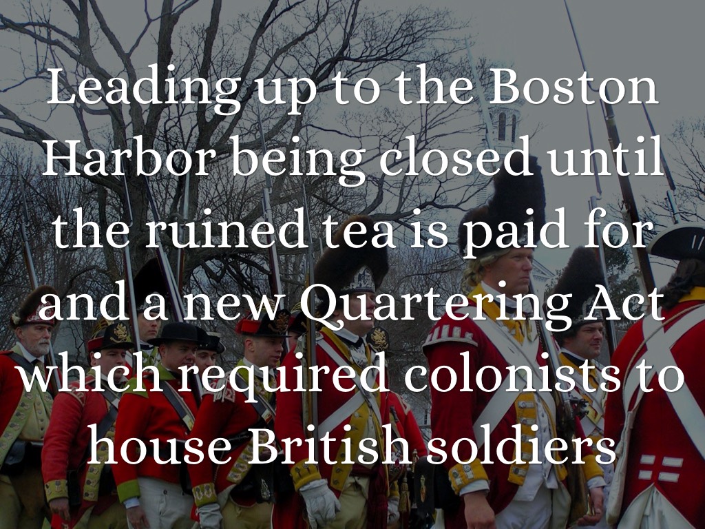 Leading up to the Boston Harbor being closed until the ruined tea is paid for and a new Quartering Act which required colonists to house British soldiers