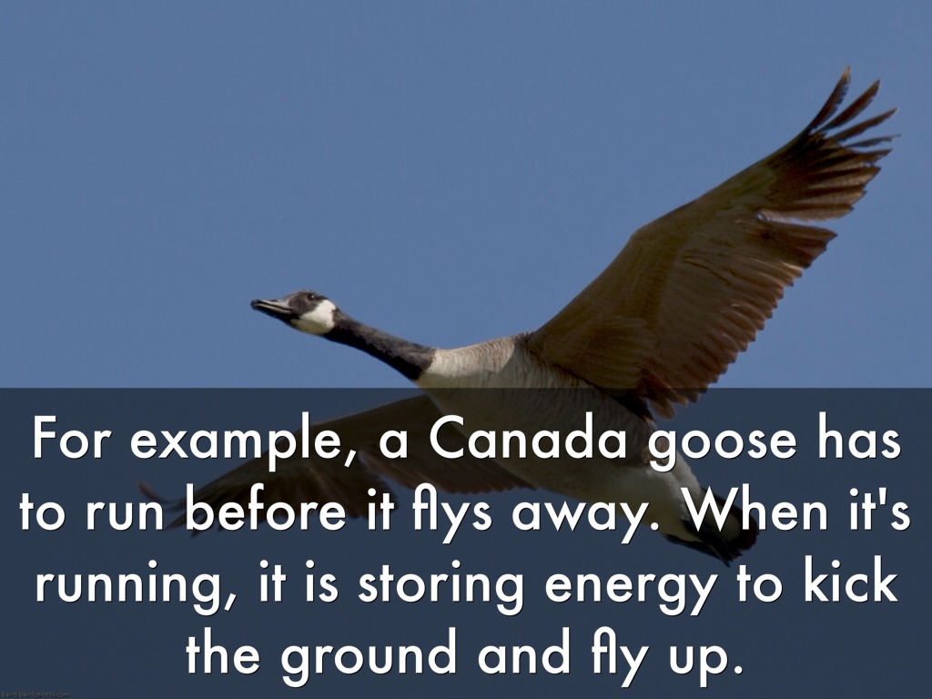 For example, a Canada goose has to run before it flys away. When it's running, it is storing energy to kick the ground and fly up.