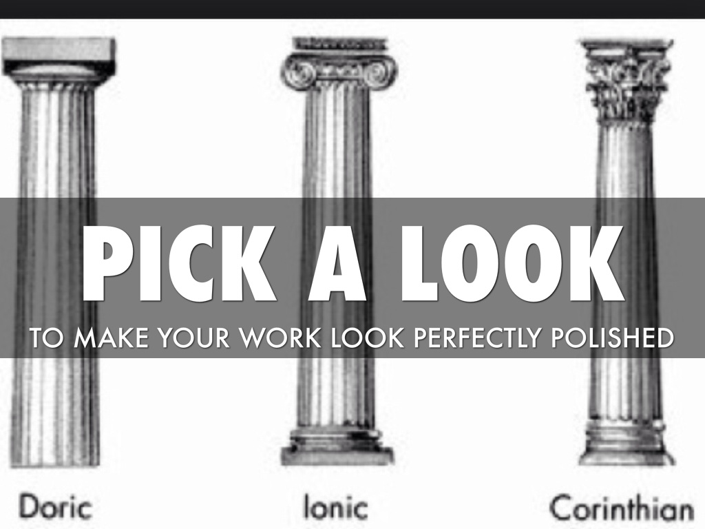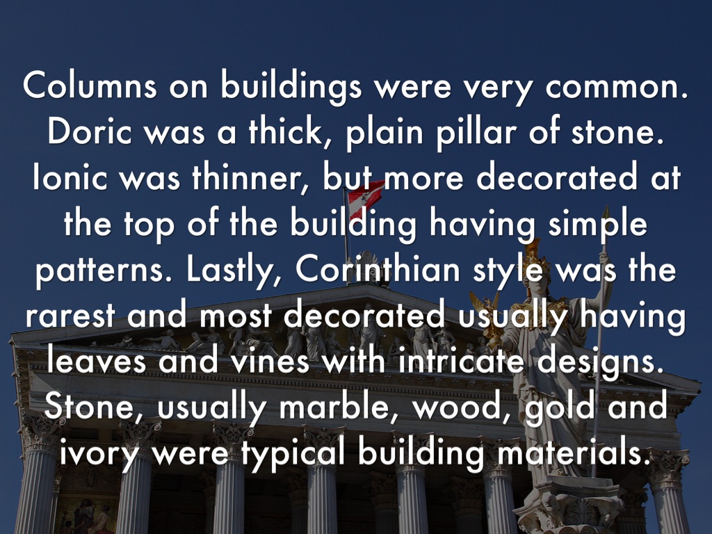 Columns on buildings were very common. Doric was a thick, plain pillar of stone. Ionic was thinner, but more decorated at the top of the building having simple patterns. Lastly, Corinthian style was the rarest and most decorated usually having leaves and vines with intricate designs. Stone, usually marble, wood, gold and ivory were typical building materials.