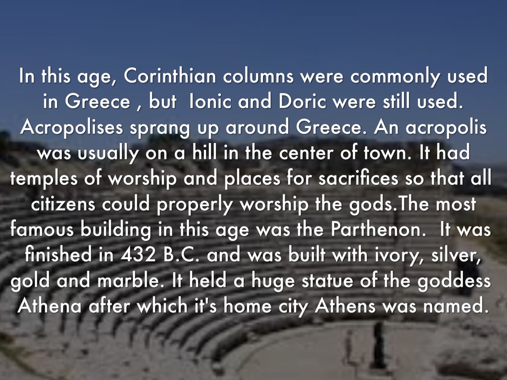 In this age, Corinthian columns were commonly used in Greece , but Ionic and Doric were still used. Acropolises sprang up around Greece. An acropolis was usually on a hill in the center of town. It had temples of worship and places for sacrifices so that all citizens could properly worship the gods.The most famous building in this age was the Parthenon. It was finished in 432 B.C. and was built with ivory, silver, gold and marble. It held a huge statue of the goddess Athena after which it's home city Athens was named.
