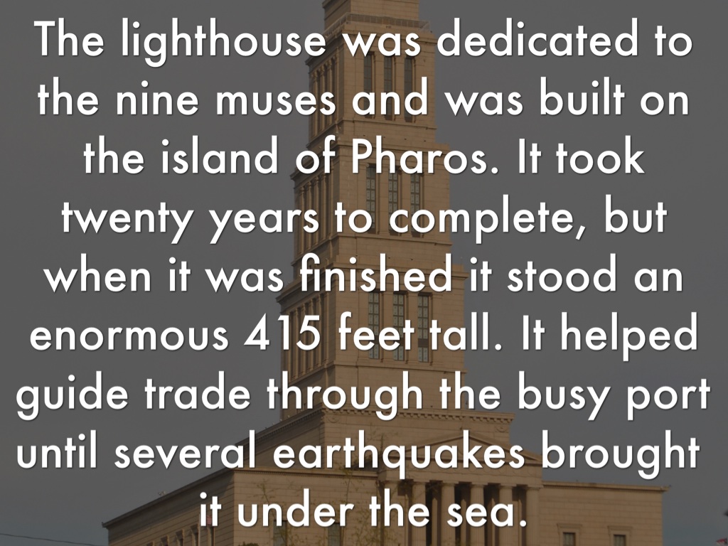 The lighthouse was dedicated to the nine muses and was built on the island of Pharos. It took twenty years to complete, but when it was finished it stood an enormous 415 feet tall. It helped guide trade through the busy port until several earthquakes brought it under the sea.