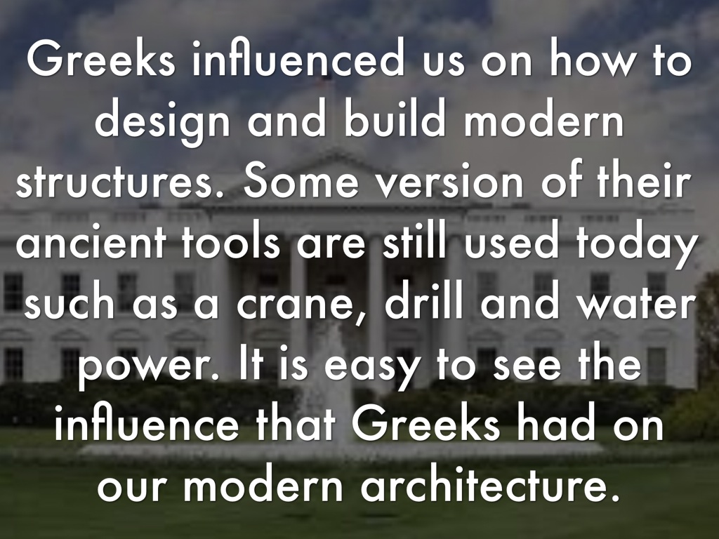 Greeks influenced us on how to design and build modern structures. Some version of their ancient tools are still used today such as a crane, drill and water power. It is easy to see the influence that Greeks had on our modern architecture.