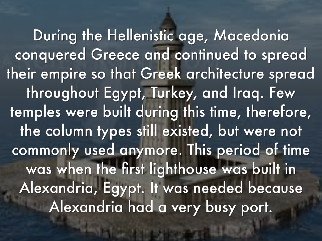During the Hellenistic age, Macedonia conquered Greece and continued to spread their empire so that Greek architecture spread throughout Egypt, Turkey, and Iraq. Few temples were built during this time, therefore, the column types still existed, but were not commonly used anymore. This period of time was when the first lighthouse was built in Alexandria, Egypt. It was needed because Alexandria had a very busy port.