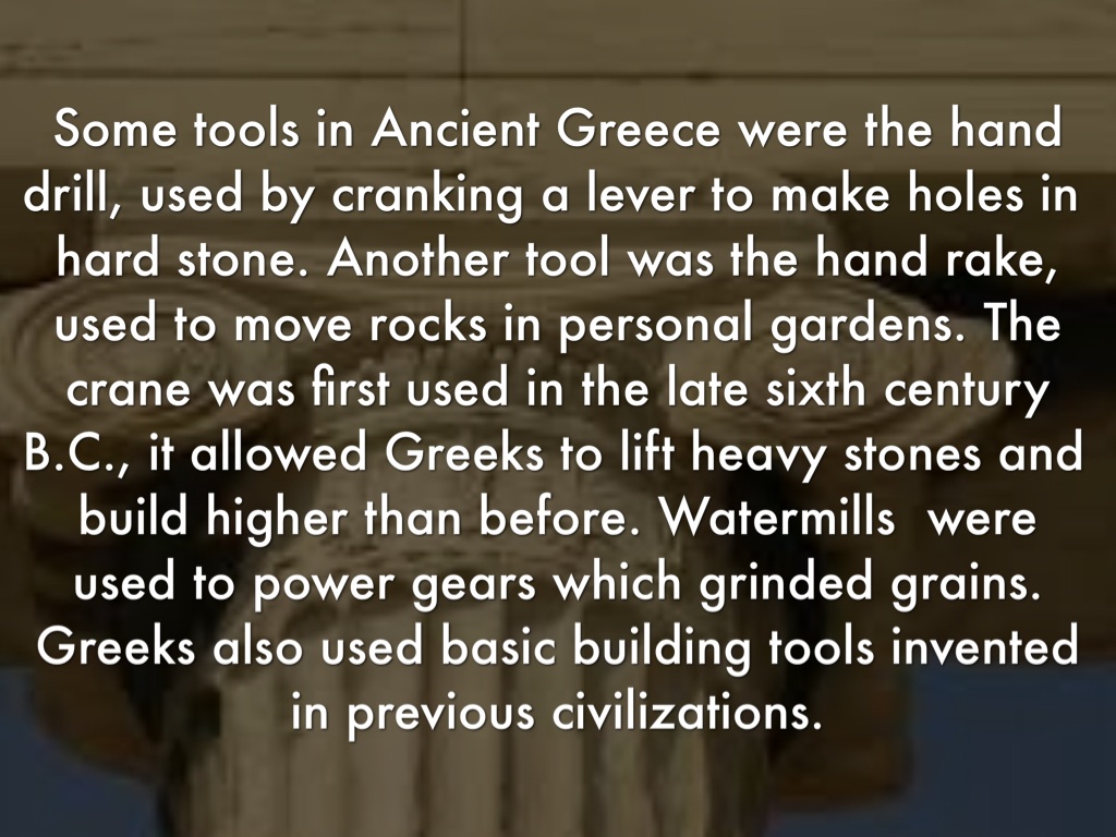 Some tools in Ancient Greece were the hand drill, used by cranking a lever to make holes in hard stone. Another tool was the hand rake, used to move rocks in personal gardens. The crane was first used in the late sixth century B.C., it allowed Greeks to lift heavy stones and build higher than before. Watermills were used to power gears which grinded grains. Greeks also used basic building tools invented in previous civilizations.
