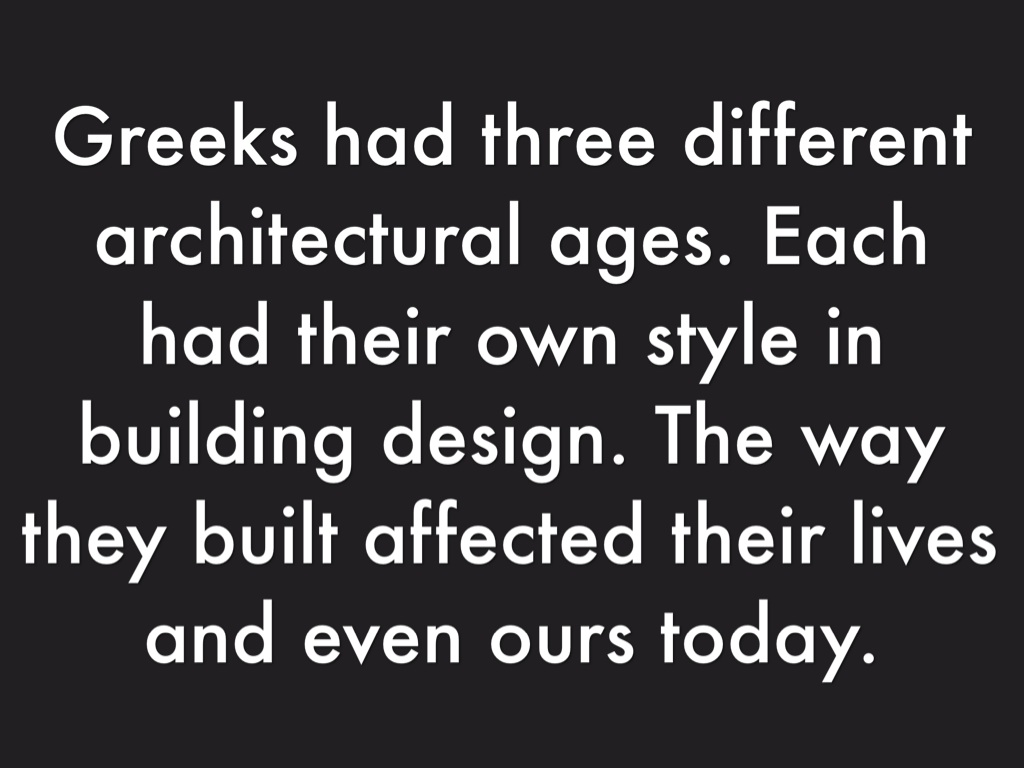 Greeks had three different architectural ages. Each had their own style in building design. The way they built affected their lives and even ours today.