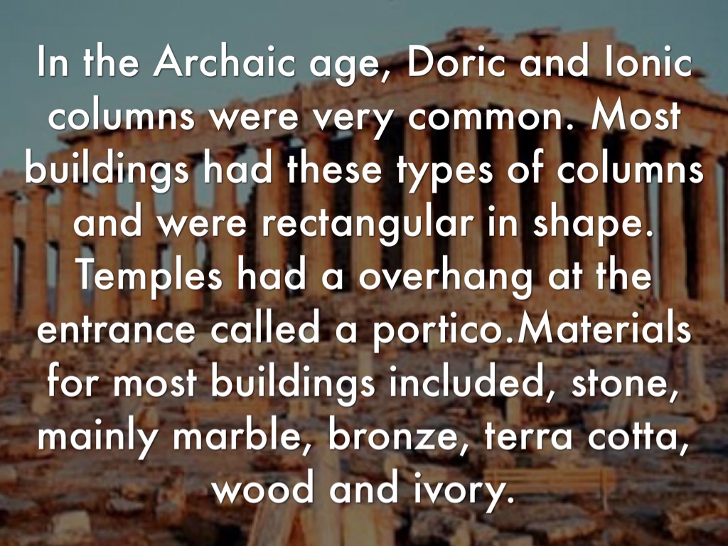 In the Archaic age, Doric and Ionic columns were very common. Most buildings had these types of columns and were rectangular in shape. Temples had a overhang at the entrance called a portico.Materials for most buildings included, stone, mainly marble, bronze, terra cotta, wood and ivory.