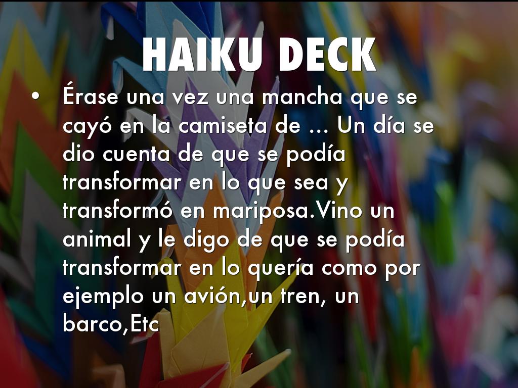 Érase una vez una mancha que se cayó en la camiseta de ... Un día se dio cuenta de que se podía transformar en lo que sea y transformó en mariposa.Vino un animal y le digo de que se podía transformar en lo quería como por ejemplo un avión,un tren, un barco,Etc