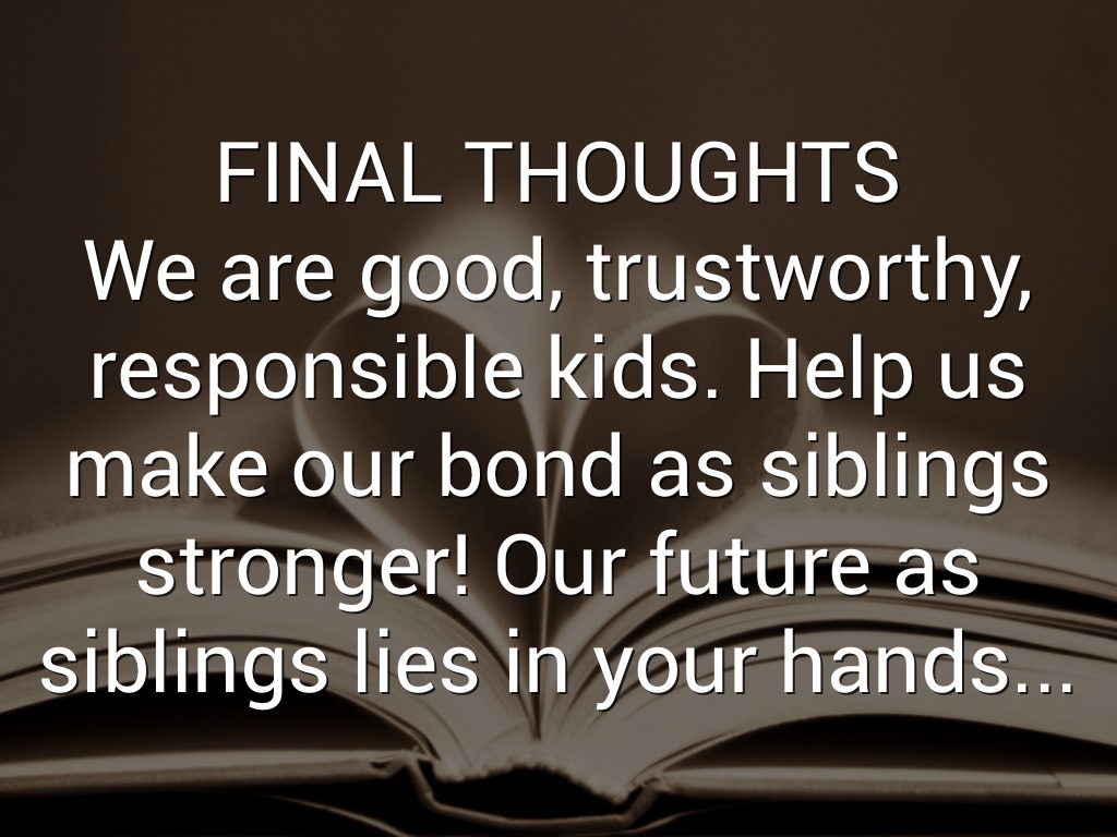 We are good, trustworthy, responsible kids. Help us make our bond as siblings stronger! Our future as siblings lies in your hands...