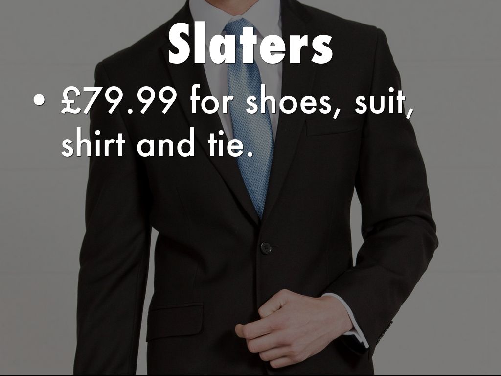 • £79.99 for shoes, suit, shirt and tie.
