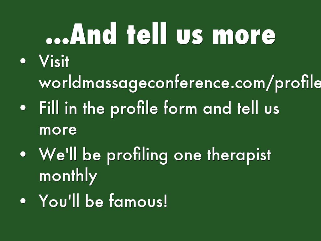 Where in the world are you? We want to get to know you and other World Massage Conference participants. Here's how you can become our featured therapist of the month...